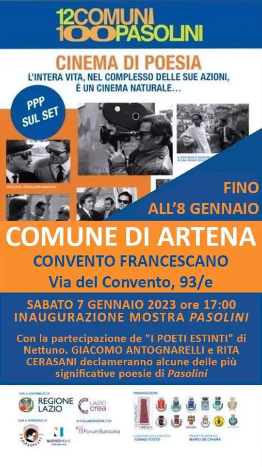 Sabato 7 gennaio prossimo – alle ore 17:00 – nella sala San Francesco del convento francescano di Artena si terrà l’evento inaugurale della mostra dedicata a Pier Paolo Pasolini.