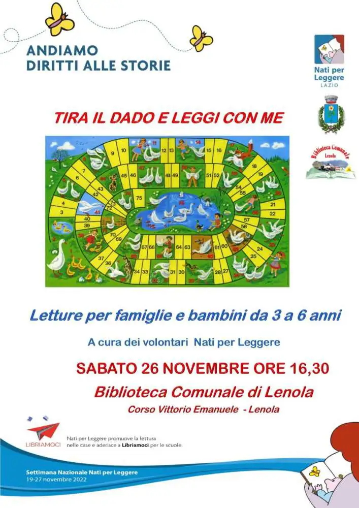Sabato 26 Novembre, alle ore 16.30, presso la *Biblioteca Comunale di Lenola*, le volontarie del programma Nati per leggere invitano le famiglie con i bambini da 3 … a … 6 anni a una giornata per celebrare il Diritto alle Storie, che si tiene in tutta Italia.