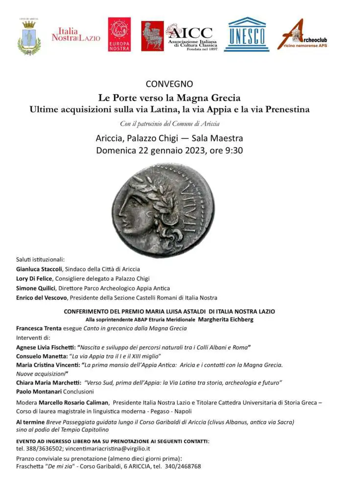 Il Dipartimento di Archeologia, creato in seno a Italia Nostra-Consiglio Regionale del Lazio, componente di Europa Nostra, ha organizzato il Convegno intitolato Le Porte verso la Magna Grecia: ultime acquisizioni sulla via Latina, la via Appia e la via Prenestina, che avrà luogo domenica 22 gennaio prossimo, nel Palazzo Chigi di Ariccia (Sala Maestra), con inizio alle ore 9,30. L’evento è patrocinato dal Comune di Ariccia.