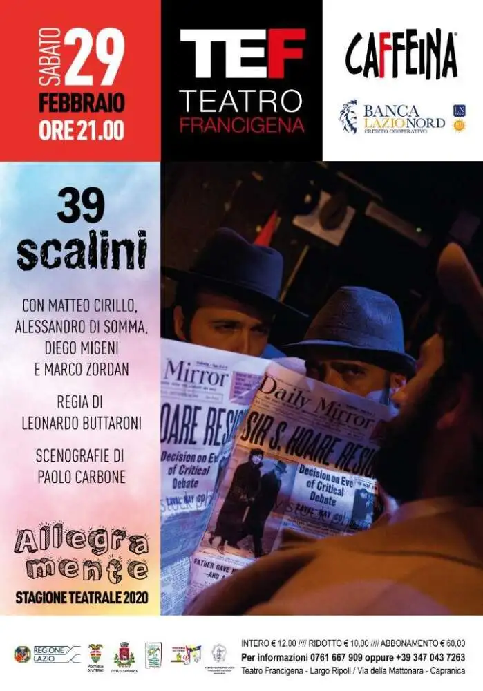 Nell’ambito della terza edizione della rassegna Francigena Live Festival, Sabato 29 Febbraio 2020 dalle ore 21.00, presso il Teatro Francigena di Capranica, “39 scalini”