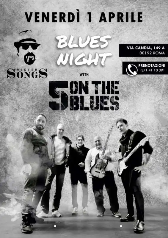 Presso il Mister Songs, Via Candia, 149, zona San Pietro, si esibiranno i 5 ON THE BLUES, formazione composta da musicisti di grande esperienza a livello nazionale, che porteranno sul palco i grandi classici di Muddy Waters, Little Walter, B.B. King, Clapton e John Mayall dal vivo. Si tratta di uno spettacolo dedicato al genere musicale più influente di sempre con le cover di artisti immortali.