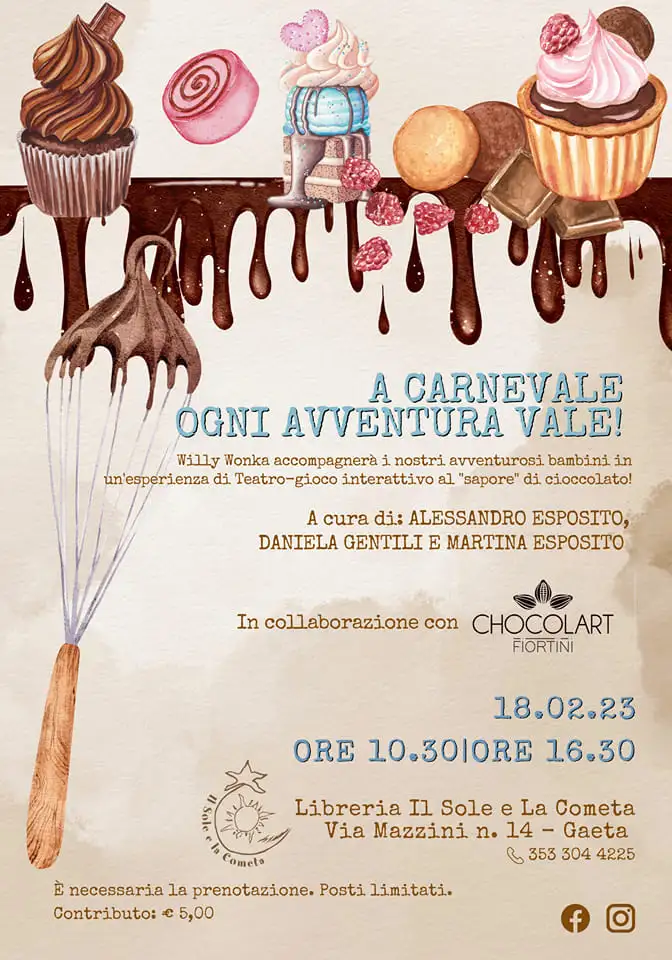 Direttamente dal favoloso romanzo di Dahl, Willy Wonka accompagnerà un gruppo di avventurosi bambini in un’esperienza di Teatro-gioco interattivo al “sapore” di cioccolato!