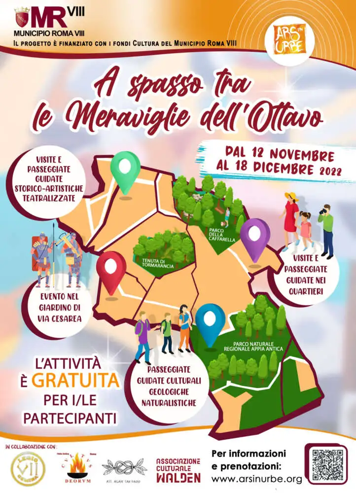 L’Associazione Culturale di Promozione Sociale “Ars in Urbe” è lieta di presentarvi il progetto A spasso tra le Meraviglie dell’Ottavo, risultato vincitore dell’Avviso Pubblico “COOLtura e sport: esercizi per il mondo che verrà”, area tematica 2: valorizzazione del patrimonio storico e artistico territoriale e del turismo dolce locale” del Municipio VIII di Roma Capitale, che si svolgerà dal12 Novembre al18 Dicembre 2022.