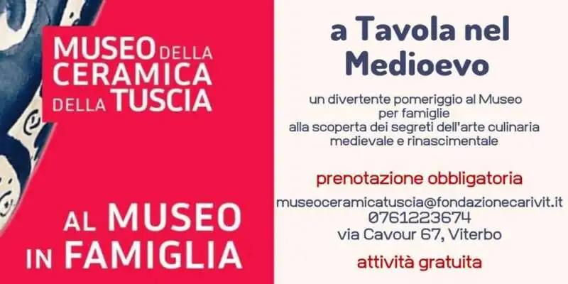 Per info e prenotazioni: museoceramicatuscia@fondazionecarivit.it, 0761346136, 0761223674 o direttamente al museo in via Cavour 67, Viterbo.