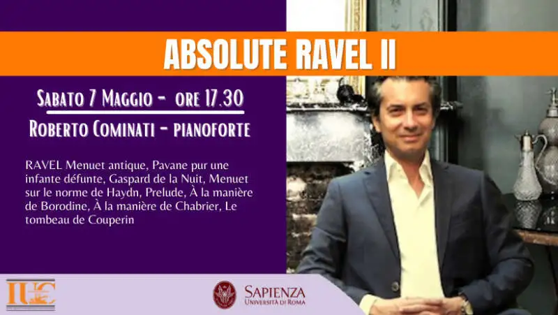Lanciato giovanissimo dalla IUC nel 1994 da fresco vincitore del prestigioso e selettivo concorso Busoni, apprezzato dalla stampa per “il pianismo stilisticamente impeccabile e mimetico” (La Repubblica), Roberto Cominati ci guiderà nel seducente mondo sonoro di Ravel.