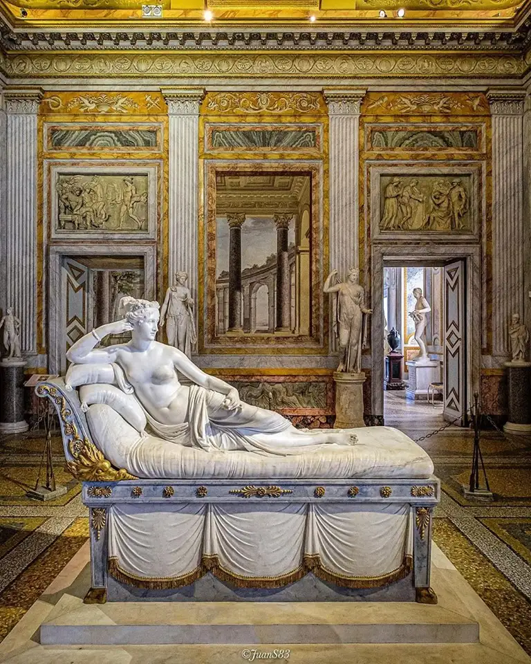 Benché avviata da un “Cardinal Nepote” e sempre legata alla curia papale, la galleria Borghese è probabilmente il museo più bello e più erotico del mondo. In ogni sala si incontrano quadri o sculture che ritraggono cosce tornite, seni rigonfi, labbra dischiuse, ombre carezzevoli, veli che scivolano, dita frementi. Talvolta cis i limita alla rarefatta atmosfera del simbolo (come nella “Dama col liocorno” di Raffaello). In altri casi l’ero è evidentissimo. Nella “Danae” di Correggio la fanciulla accoglie la pioggia d’oro con un gesto esplicito, mente Amore scosta le lenzuola. Traboccanti di amore carnale sono le sculture del Bernini. Apollo insegue Dafne, e appena riesce a toccarla ecco la pelle liscia di lei trasformarsi in scorza di albero, con un capolavoro di virtuosismo marmoreo senza uguali. Plutone smania cercando di trattene Proserpina che si dibatte fra le sue braccia. E ancora Domenichino, nella “Caccia di Diana”, pone le ninfe nelle acque cristalline, in uno sbocciare di sguardi malandrini. L’apoteosi è infine la “Paolina Borghese” scolpita dal Canova: il marmo in origine era spalmato di cera rosata e mostrato al lume di candela a pochi, selezionati ospiti.