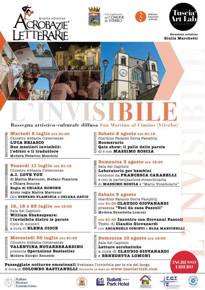 La IV edizione di ACROBAZIE LETTERARIE – rassegna artistico-culturale diffusa, patrocinata dal Comune di Viterbo – prende il via l’8 luglio e prosegue fino al 10 agosto, animando gli spazi più iconici e suggestivi di San Martino al Cimino. Il tema di quest’anno è L’INVISIBILE, trattato acrobaticamente come un elemento presente nella sua assenza. L’intera manifestazione è un mix emozionante e coinvolgente che combina letteratura, teatro, giochi letterari partecipati, attività per bambini e passeggiate emozionali in notturna.