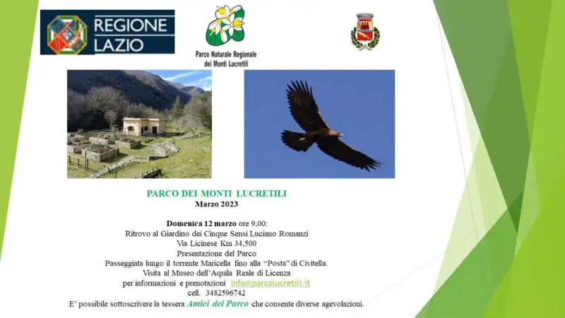 Al Giardino dei Cinque Sensi Luciano Romanzi La giornata si svolgerà secondo questo programma Domenica 12 marzo ore 9,00: Ritrovo al Giardino dei Cinque Sensi Luciano Romanzi Via Licinese Km 34,500 Presentazione del Parco Passeggiata lungo il torrente Maricella fino alla “Posta” di Civitella. Visita al Museo dell’Aquila Reale di Licenza per informazioni e prenotazioni [...]...