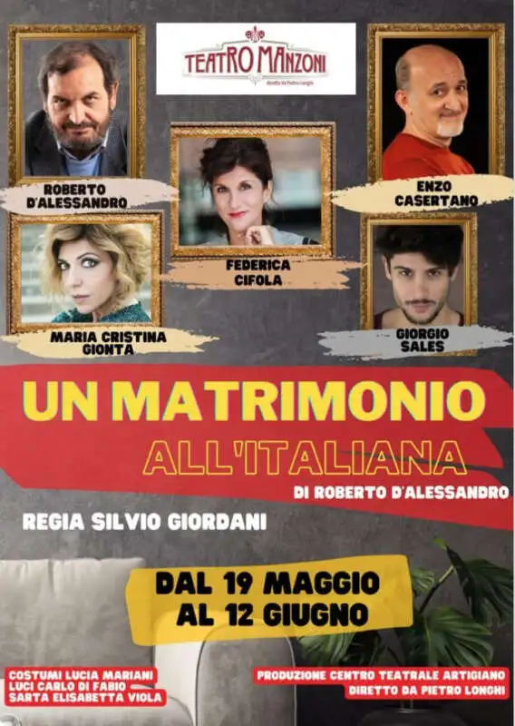 Al Teatro Manzoni va in scena l’ultimo spettacolo previsto in cartellone per questa stagione, ovvero “Un matrimonio all’Italiana”, scritto da Roberto D’Alessandro per la regia di Silvio Giordani con lo stesso Roberto D’Alessandro, Federica Cifola, Enzo Casertano, Maria Cristina Gionta, Giorgio Sales., dal 19 maggio al 12 giugno. I vecchi adagi popolari possono avere ancora un valore in questo mondo così multietnico e globalizzato? I protagonisti dello spettacolo rispecchiano un po’ il detto “mogli e buoi dei paesi tuoi”. Una tipica commedia all’italiana, divertente , spensierata, nella quale si affrontano comunque temi complessi appartenenti all’epoca che stiamo vivendo.