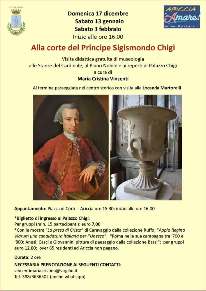 I visitatori conosceranno le Stanze del Cardinale, il Piano Nobile e i reperti conservati nella dimora barocca come il “Vaso Chigi” e la “Spada di Ariccia”. Il punto di forza di questi incontri, a cura dell’archeologa/museologa Maria Cristina Vincenti (che è anche guida Aigae), è la professionalità e l’offerta diversificata con approfondimenti che riguarderanno i reperti in contesto museale, le preziose collezioni del Palazzo Chigi e le decorazioni pittoriche sia del Palazzo che della Locanda Martorelli, il trekking archeologico e la viabilità antica, per finire con i luoghi di culto. Sigismondo, figlio di Agostino Chigi Della Rovere di sua moglie, Maria Giulia Albani, era un appassionato di archeologia promosse scavi archeologici con importanti rinvenimenti alcuni dei quali conservati nel Palazzo Chigi di Ariccia; amava la poesia e fu il committente di pregevoli cicli pittorici per il Palazzo Chigi di Roma e per quello di Ariccia. Il suo bibliotecario era Ennio Quirino Visconti. Membro dell’Arcadia ed illuminista frequentò Vittorio Alfieri, Metastasio e Vincenzo Monti.