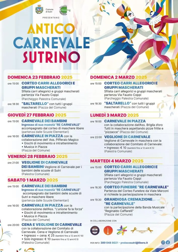 La Pro Loco di Sutri con il patrocinio del Comune di Sutri e le Associazioni locali Comitato Carnevale Sutri Briglia D’Oro Pifferaio Magico L’unione fa la forza sono pronte a farvi vivere un Carnevale indimenticabile!