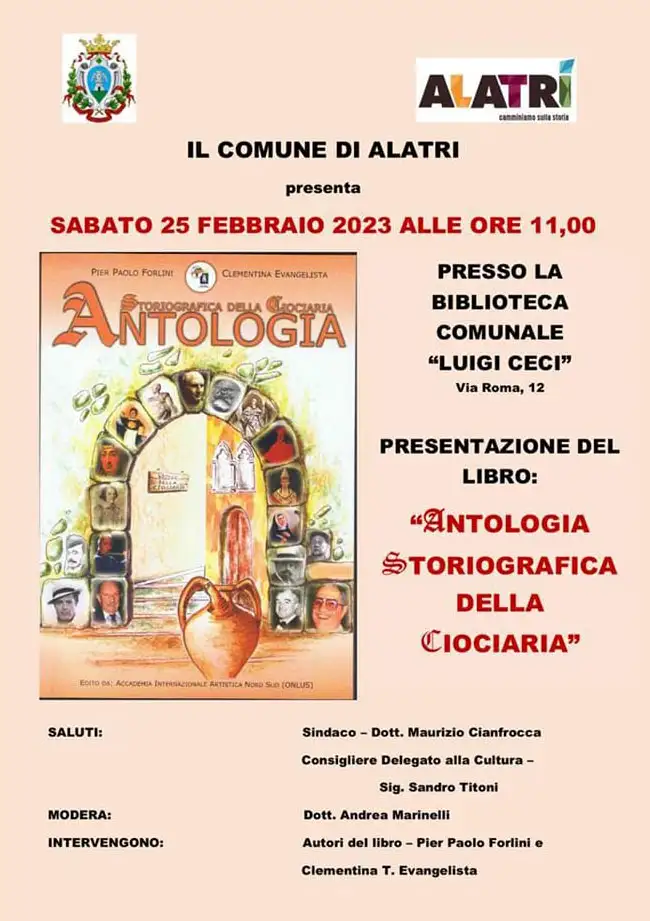 Sabato 25 Febbraio 2023 ad Alatri presso la Biblioteca Comunale si terrà, alle ore 11.00, la presentazione del libro “Antologia Storiografica della Ciociaria”.