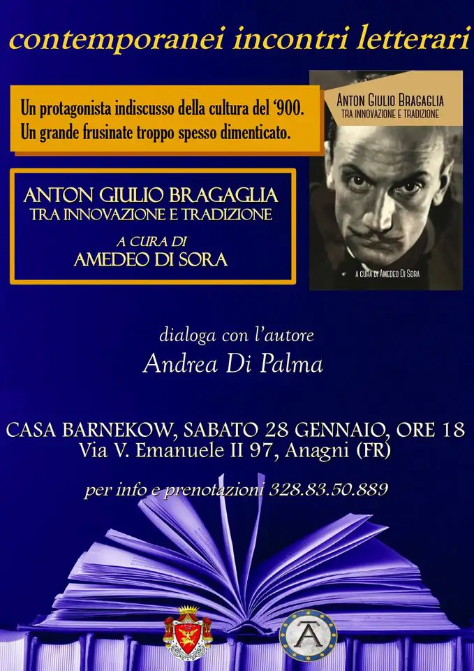 Sabato 28 gennaio, alle ore 18:00, sarà infatti ospite della rassegna letteraria il regista, attore e autore di Frosinone Amedeo Di Sora che, coadiuvato dal giovane attore e regista di Anagni Andrea Di Palma, presenterà la pubblicazione da lui curata “Anton Giulio Bragaglia, tra innovazione e tradizione”. Pubblicazione che, oltre a raccogliere gli atti dell’omonimo convegno tenutosi nel 2019, presso il Salone di Rappresentanza della Provincia di Frosinone, contiene altri importanti saggi di autorevoli studiosi, tutti dedicati all’attività e all’opera multiforme di A. G. Bragaglia, protagonista indiscusso della scena novecentesca in Italia ed Europa, regista teatrale e cinematografico, scenografo e scenotecnico, ideatore di testate letterarie, teorico e storico dello spettacolo, animatore culturale e promotore delle più diverse iniziative artistiche.