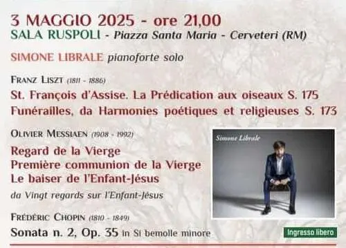 Sabato 3 maggio alle ore 21:00 in Sala Ruspoli, una serata dedicata al pianoforte e ai grandi virtuosi degli 88 tasti. Ad esibirsi, il Maestro Simone Librale, con un repertorio che spazierà da Franz Liszt, Olivier Messiaen e Frédéric Chopin. L’ingresso al concerto è libero e gratuito.