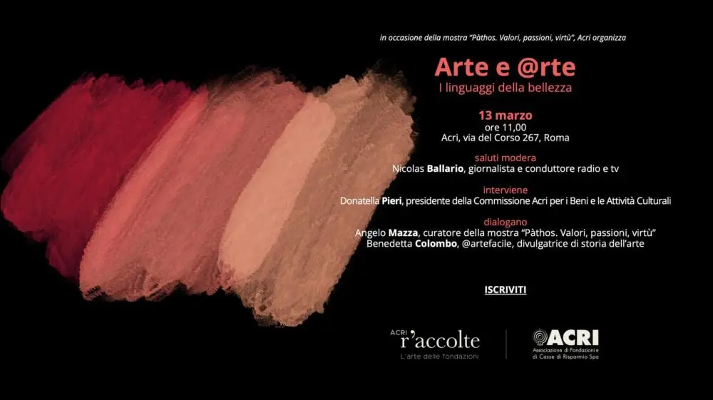 L’evento si tiene in occasione della prima mostra virtuale realizzata nell’ambito di R’Accolte, il più grande catalogo multimediale in Italia, promosso dalla Commissione per i Beni e le Attività Culturali di Acri, che con l’inizio del 2024 ha inaugurato una nuova fase del suo impegno di valorizzazione culturale avviando un ciclo di mostre virtuali volte ad offrire al pubblico l’opportunità di conoscere ed esplorare le collezioni d’arte delle Fondazioni di origine bancaria in modi del tutto innovativi. La prima esposizione dal titolo “Pathos. Valori, passioni, virtù” è visitabile gratuitamente su www.pathos-raccolte.it fino al 31 marzo 2024.