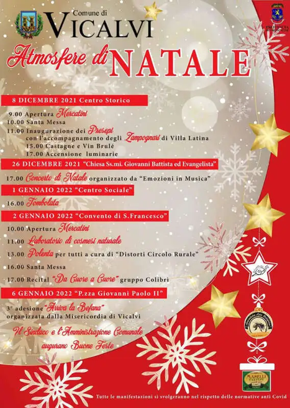 L’8 e il 26 Dicembre 2021 e il 2 e 6 gennaio 2022 appuntamento con “Atmosfere di Natale” tutti gli eventi del Natale di Vicalvi.