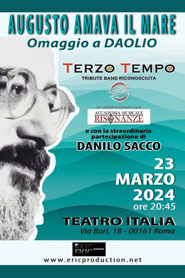 La Band del Terzo Tempo Nomadi Roma insieme alla straordinaria partecipazione di DANILO SACCO alla voce, e alla collaborazione dell’Accademia Musicale Risonanze, il 23 marzo 2024 al Teatro ITALIA in Roma, porterà in scena uno spettacolo emozionante e coinvolgente sulla storia musicale dell’indimenticabile Augusto Daolio e la musica dei Nomadi, la sua arte, le sue poesie all’interno della storia artistica di uno dei gruppi più longevi e seguiti della musica italiana, che ha all’attivo migliaia di concerti seguiti dal – popolo nomade – in oltre sessant’anni di carriera.