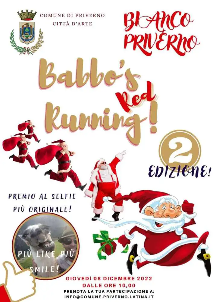 Sono aperte le adesioni per la 2a edizione della Babbo’s red Running, la corsa sociale degli atleti delle palestre e associazioni sportive di Priverno e non solo, per una vivace staffetta tinta di orde di cappelli rossi a invadere le strade della città di Priverno, con lo stop per il selfie pazzo in Piazza Giovanni XXIII da condividere in tempo reale sulla pagina Fb @privernoilborgoparlante.