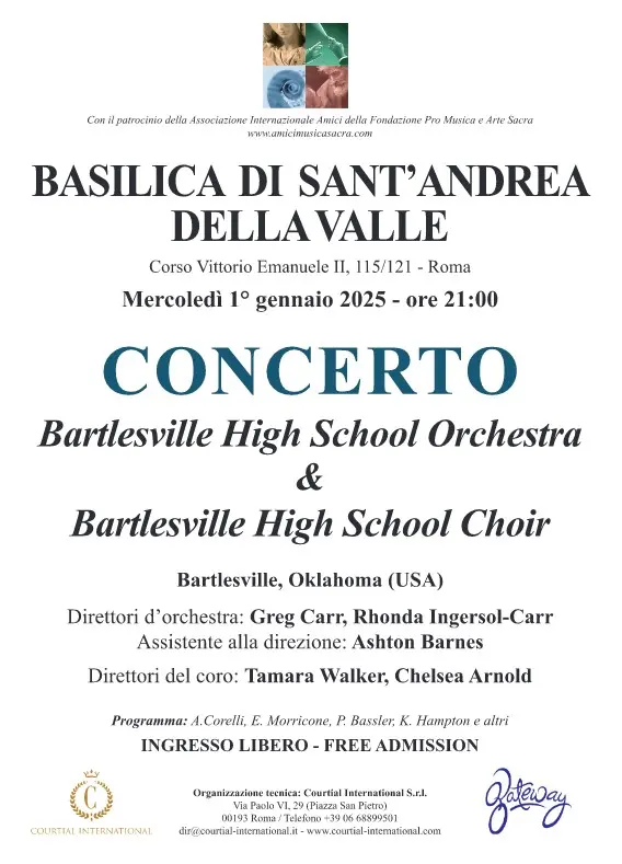 L’Associazione Internazionale Amici della Fondazione Pro Musica e Arte Sacra è lieta di presentare la Bartlesville High School Orchestra e il Bartlesville High School Choir, che si esibiranno il 1° gennaio 2025 alle ore 21 nella suggestiva cornice della Basilica di Sant’Andrea della Valle a Roma.