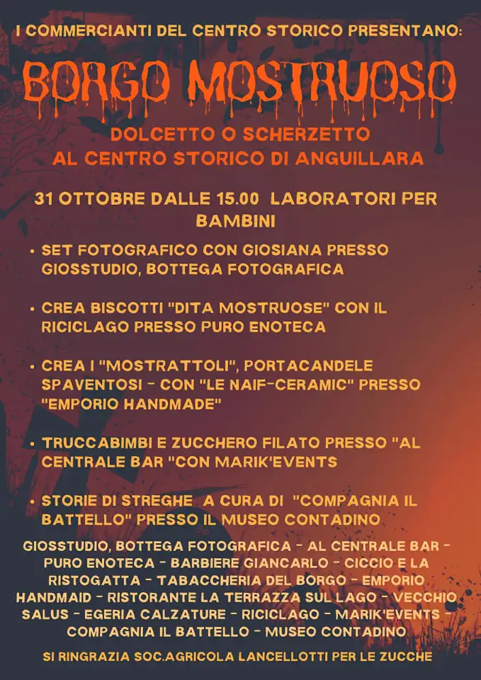 Il borgo mostruoso è organizzato dai commercianti del centro storico : Al Centrale Puro Enoteca Le Naïf Ceramic LAB Ristorante Ciccio e La Ristogatta La terrazza sul lago Calzature Egeria Gios Fotografia Vecchio Salus Marik’Events @tabaccheriadelborgo Domus Angularia @barbiere Giancarlo Compagnia IL Battello