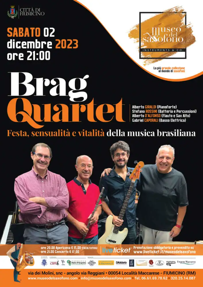 Grande festa dedicata al “Brazilian jazz” in programma sabato 2 dicembre alle ore 21:00 al Museo di Saxofono di Fiumicino. Attilio Berni, direttore del Museo, ha infatti invitato a partecipare con un nuovo significativo progetto, il Brag Quartet, formato dal compositore Alberto Giraldi al pianoforte, Stefano Rossini a batteria e percussioni, Alberto D’Alfonso a flauto e sax alto e Gabriel Caporali al basso elettrico.