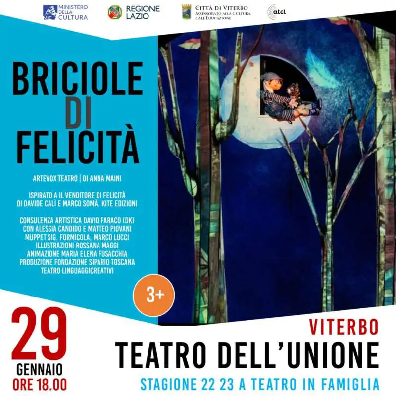 Domenica 29 Gennaio alle ore 18, il Teatro dell’Unione di Viterbo, all’interno della stagione “A teatro in famiglia 2022-2023”, mette in scena “Briciole di felicità“, lo spettacolo per bambini dai 3 anni, scritto da Anna Maini, ispirato a “Il Venditore di felicità” di Davide Calì e Marco Somà e presentato dalla Artevox Teatro. Non lontano da qui esiste un bosco di case sospese, dove irrompe all’improvviso il Venditore di felicità: vende felicità in barattolo. Senz’altro gli abitanti del villaggio la comprano, ne hanno un gran bisogno. Peccato però, i barattoli sono vuoti.