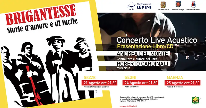 Lo stesso Cardinali accompagnerà l’autore in questo trittico di eventi. Il libro, edito dalla casa editrice Ponte Sisto, e il cd prodotto dall’etichetta tedesca Sound System Records sono composti da tredici liriche, ognuna è la storia di una Briganta, scritte da poetessa e poeti. Sono brigantesse che hanno lottato sui Monti Lepini, nelle campagne del Sud, lungo i territori dominati dal Papato o su quelli controllati dai francesi: “Sarà un momento importante che alza un velo su un fenomeno, quello del brigantaggio, che ha avuto un impatto politico, sociale e culturale molto importante per i territori lepini. Come Compagnia – ha spiegato il presidente Quirino Briganti – abbiamo fortemente voluto svolgere queste manifestazioni, proprio per avvicinare appassionati e curiosi a questo affascinante mondo. Ben vengano, dunque, queste operazioni culturali che contribuiscono a migliorare la nostra percezione dell’identità territoriale”.