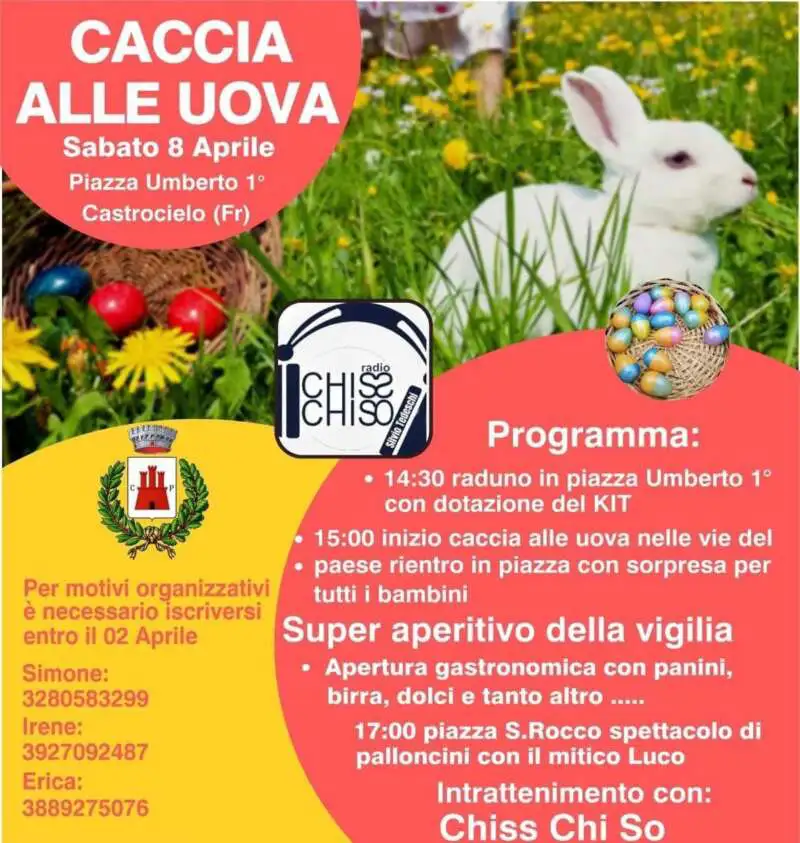 L’appuntamento è per domenica 8 aprile alle 14.30, in Piazza Umberto I, nel centro storico di Castrocielo, da dove partirà una divertente caccia alle uova pasquali. Non mancheranno momenti di allegria e tante sorprese oltre che Pop-corn per tutti.