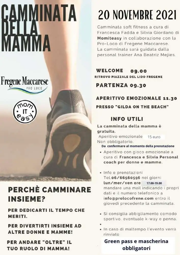 Camminata soft fitness per andare “oltre” il tuo ruolo di mamma! A cura di Francesca Fadda e Silvia Giordano di Momiteasy PARTENZA/RITROVO Piazzale del Lido – Fregene. Durata: tra le due e le tre ore. Posti limitati, prenotazione obbligatoria entro venerdì 19 novembre Per prenotare: inviare una mail con nome, cognome, numero di telefono e [...]...