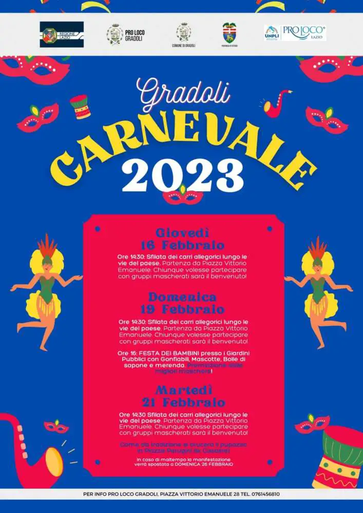 La Proloco di Gradoli organizza il Carnevale 2023, con sfilate di gruppi mascherati e carri allegorici.