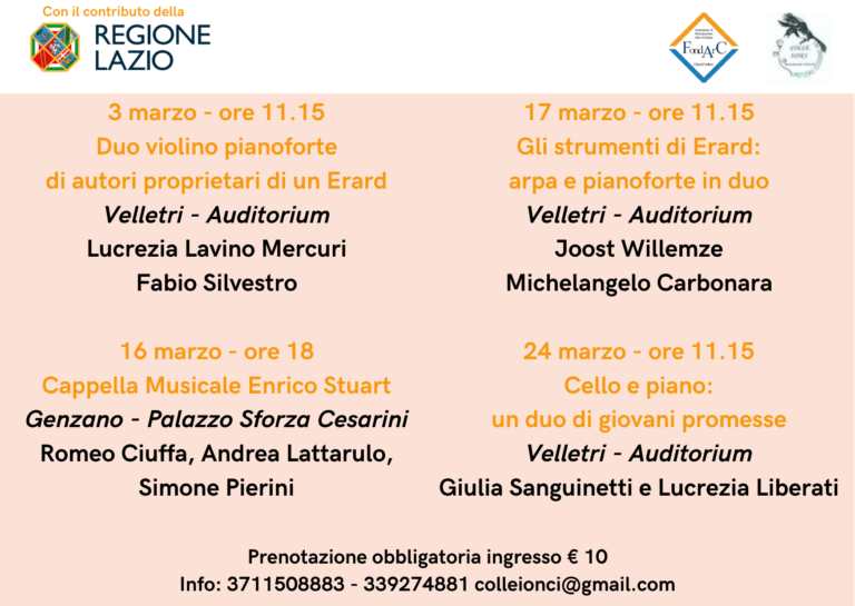 Domenica 17 marzo – alle 11.15 – a Velletri “Gli strumenti di Erard: arpa e pianoforte in duo” con Joost Willemze, all’arpa, e Michelangelo Carbonara al pianoforte Erard del 1879 con le musiche di Debussy, Ravel, Dussek e Liszt.