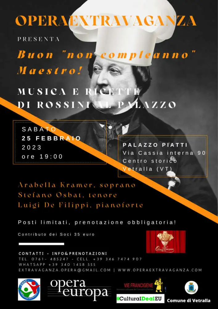 A ‘Cena con Rossini’ sarà il prossimo appuntamento stravagante di OperaExtravaganza Buon ‘Non Compleanno Maestro! Musiche e ricette di Rossini Sabato 25 febbraio alle ore 19.00 ai Saloni di Palazzo Piatti Arabella Kramer soprano |Stefano Osbat tenore | Luigi De Filippi pianoforte POSTI LIMITATI! PRENOTAZIONE OBBLIGATORIA! whatsapp 340-1458555, 0761-485247, 346-7474907...