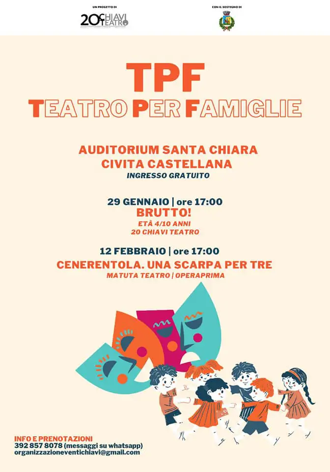 L’amministrazione comunale ha organizzato, in collaborazione con l’associazione culturale “20 Chiavi”, una rassegna teatrale denominata “TPF – Teatro Per Famiglie” che si svolgerà presso l’Auditorium Santa Chiara delle Suore Francescane, in via Vincenzo Ferretti proponendo due spettacoli.