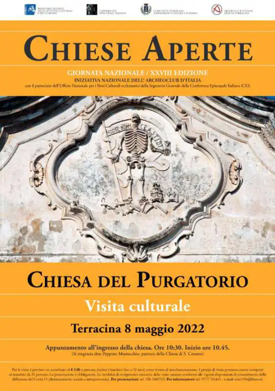 In occasione della XXVIII Giornata Nazionale delle Chiese Aperte, iniziativa promossa dall’Archeoclub d’Italia con il patrocinio dell’Ufficio Nazionale per i Beni Culturali Ecclesiastici della Segreteria Generale della Conferenza Episcopale Italiana (CEI), l’Archeoclub di Terracina ha organizzato per l’8 maggio 2022, alle ore 10,30, una visita culturale alla Chiesa del Purgatorio.