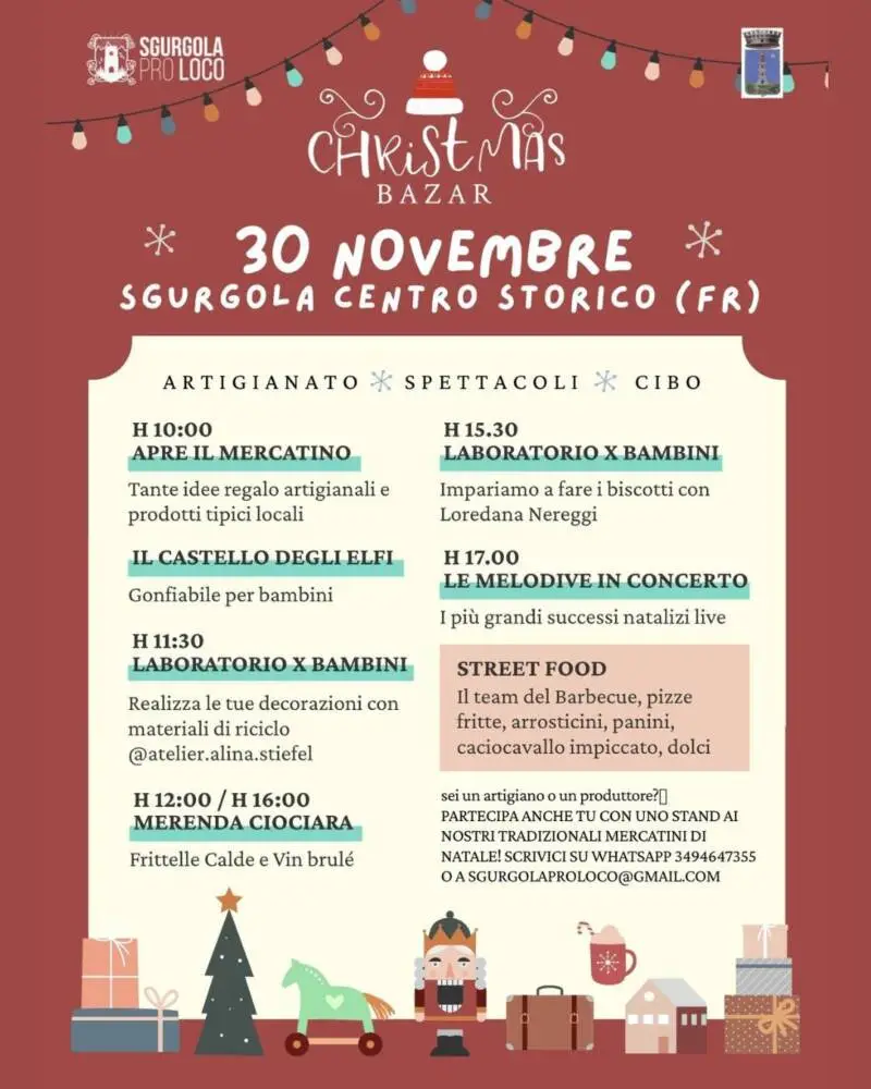 Domenica 30 novembretorna il Christmas Bazar di Sgurgola, giunto alla sua quinta edizione. Dalle 10:00, il centro storico si trasforma in un villaggio natalizio con mercatini artigianali, street food e un ricco programma per tutta la famiglia.