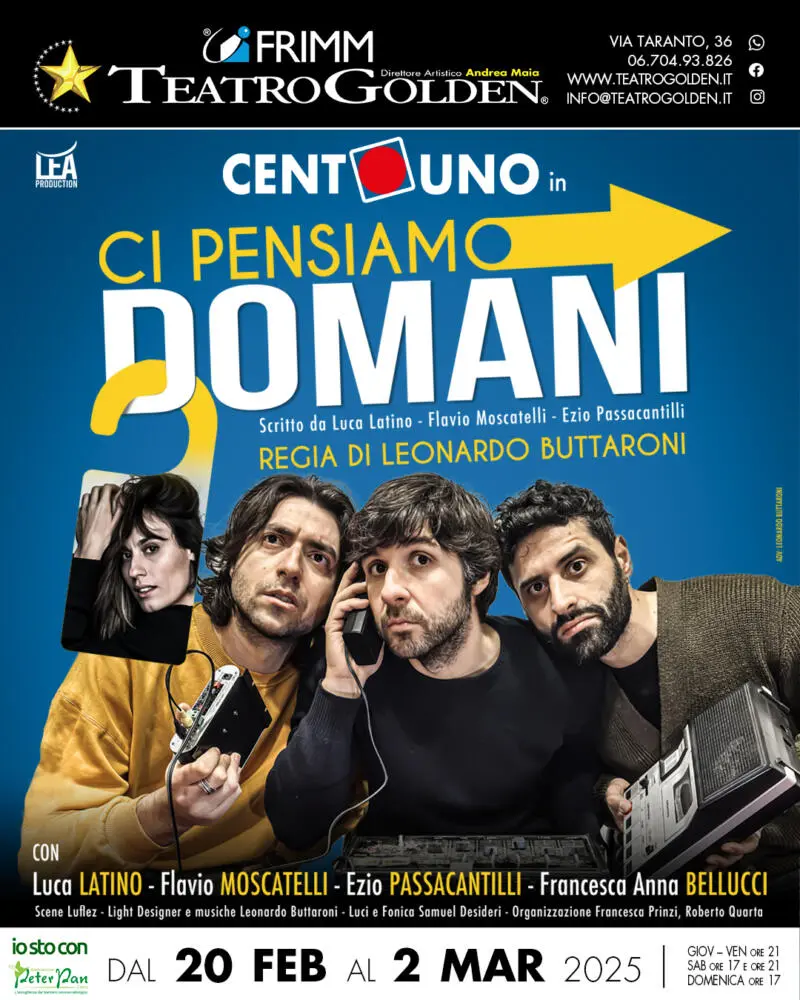 Ed è proprio questo il titolo del nuovo spettacolo de I Centouno che saranno al Teatro Golden dal 20 febbraio al 2 marzo 2025. Luca Latino, Flavio Moscatelli, Ezio Passacantilli, Francesca Anna Bellucci saranno i protagonisti assoluti di questa commedia travolgente ed esilarante: “Ci pensiamo domani”, come se il domani non esistesse, che filosoficamente è anche vero; però poi il domani puntualmente si presenta alle spalle e ci prende a schiaffi sulla nuca. A quel punto non c’è altro da fare, dobbiamo prenderci delle responsabilità. Con questa matura consapevolezza Luca, Flavio e Ezio tornano in scena con uno spettacolo esilarante sulla relatività con cui viviamo lo scorrere del tempo ed il flusso degli eventi da cui è scandito. In un susseguirsi di battute, colpi di scena, e situazioni tragicomiche il trio si trova a riscoprire insieme al pubblico il bello di concedersi momenti di divertimento puro, accantonando stress e preoccupazioni, perché a volte è sano rimandare tutto a domani.