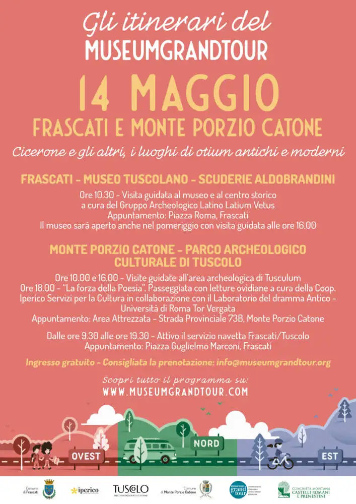 Domenica 14 maggio l’appuntamento è tra Frascati e Monte Porzio Catone con l’itinerario Cicerone e gli altri. I luoghi di otium antichi e moderni con visite guidate al Museo Tuscolano, al centro storico di Frascati e all’area archeologica di Tusculum. La giornata si concluderà con un evento speciale al Parco Archeologico Culturale di Tuscolo e che vedrà protagonisti Ovidio e lo splendido santuario extraurbano.