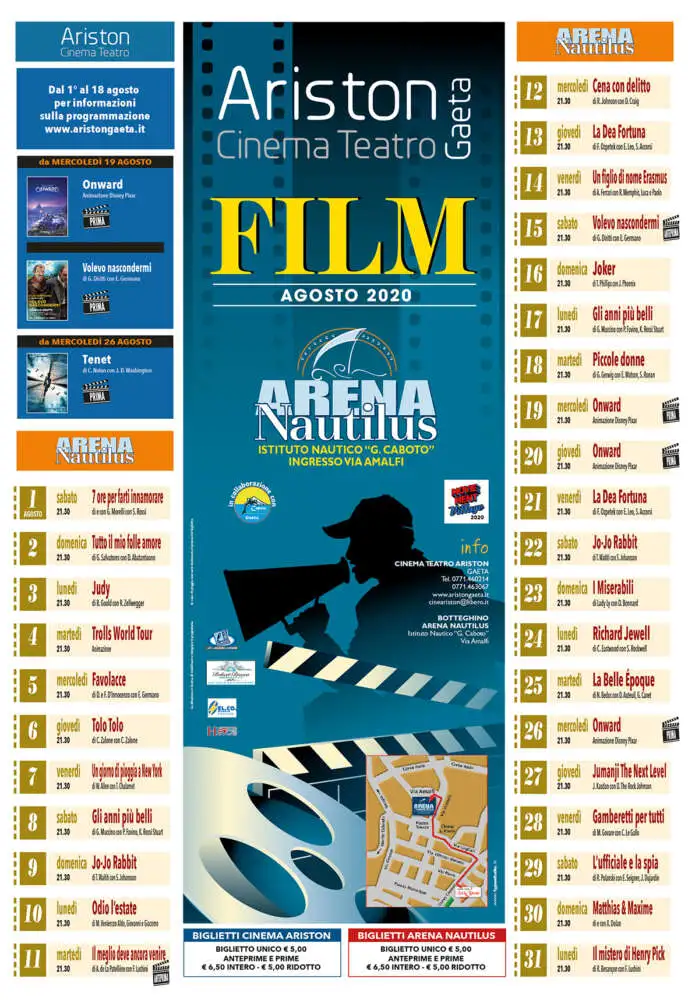 Anche ad Agosto il Cinema Sotto le Stelle all’Arena Nautilus, location allestita dal Cinema Teatro Ariston di Gaeta presso il Campetto Sportivo del’Istituto Tecnico Nautico G. Caboto di Gaeta grazie alla collaborazione del Dirigente Scolastico prof.ssa Maria Rosa Valente e di tutta la comunità del Nautico Caboto, assicurando la continuità di un cammino condiviso per la promozione della cultura, iniziato nel 2005.