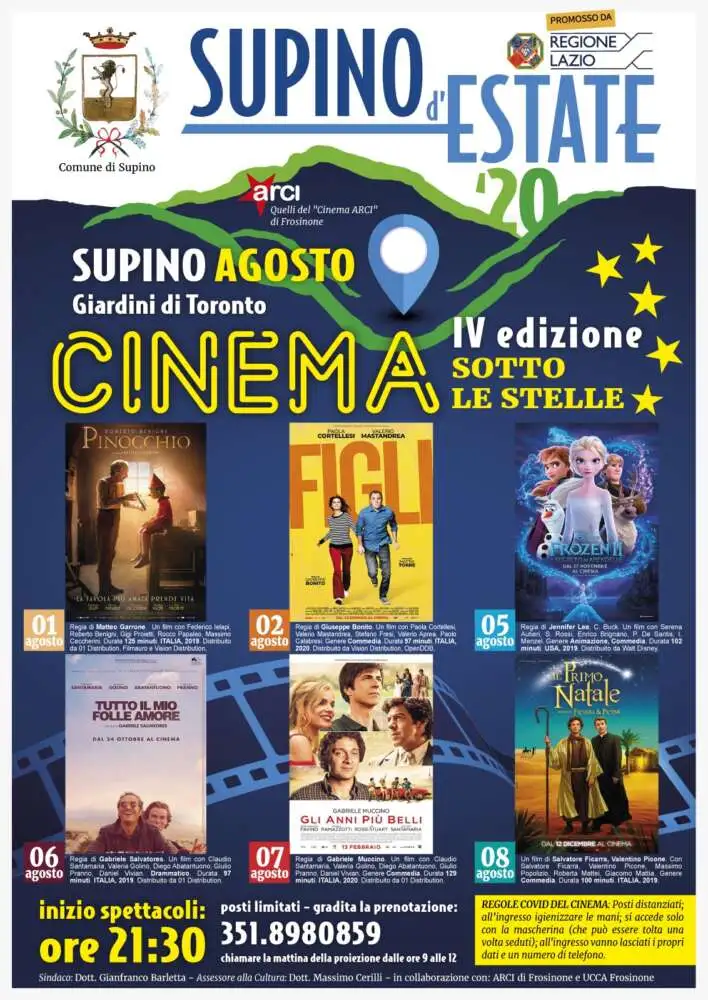 Dal 01 al 16 agosto ben 12 proiezioni allieteranno le serate estive, grazie alla rassegna Cinema Sotto le Stelle, giunta alla sua quarta Edizione, organizzata dall’Amministrazione Comunale in collaborazione con ARCI di Frosinone e UCCA Frosinone.