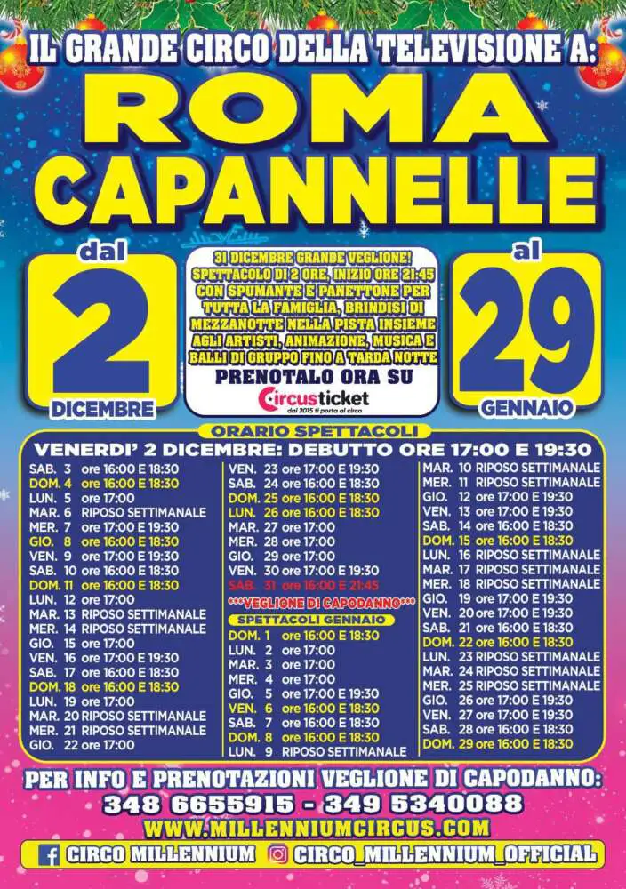 Per visionare il calendario e l’orario degli spettacoli si può visitare il sito internet www.millenniumcircus.com oppure la pagina Facebook Circo Millennium o semplicemente chiamare il numero 348/6655915.