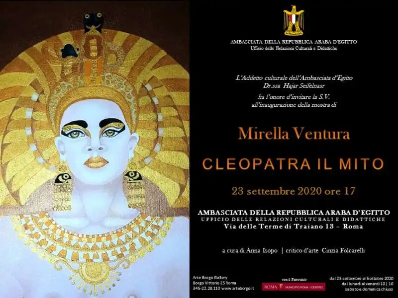 Mercoledì 23 Settembre 2020 alle ore 17.00 si inaugura presso l’Ambasciata della Repubblica Araba d’Egitto, Ufficio delle Relazioni Culturali e Didattiche, la mostra Cleopatra “il Mito” personale di Mirella Ventura a cura di Anna Isopo con testo e presentazione a cura del critico d’arte Cinzia Folcarelli.