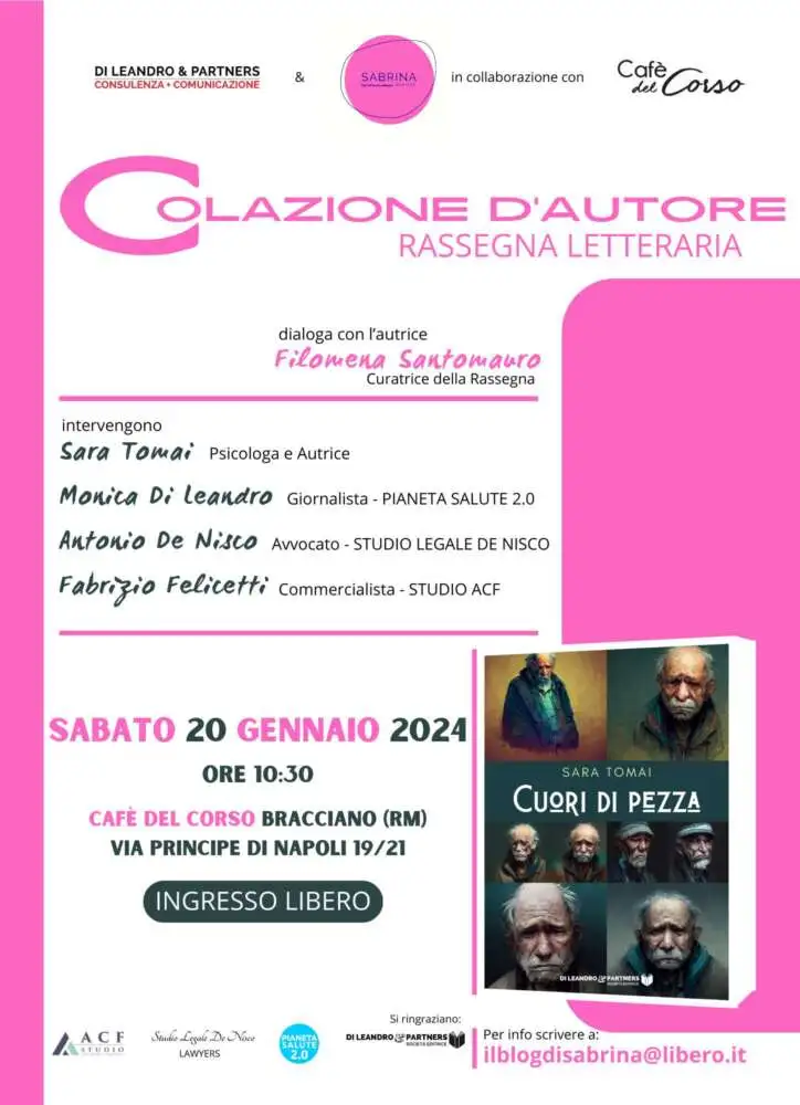 Sabato 20 Gennaio 2024, dalle ore 10:30 presso il Cafè del Corso, in v. Principe di Napoli a Bracciano, debutta Colazione d’Autore, la rassegna letteraria promossa e organizzata dall’Ag. Letteraria Il Blog di Sabrina del Gruppo Editoriale Di Leandro & Partners. Questo primo incontro prevede la presentazione del libro Cuori di pezza di Sara Tomai – Ed. Di Leandro, storie di persone con demenze e alzheimer.