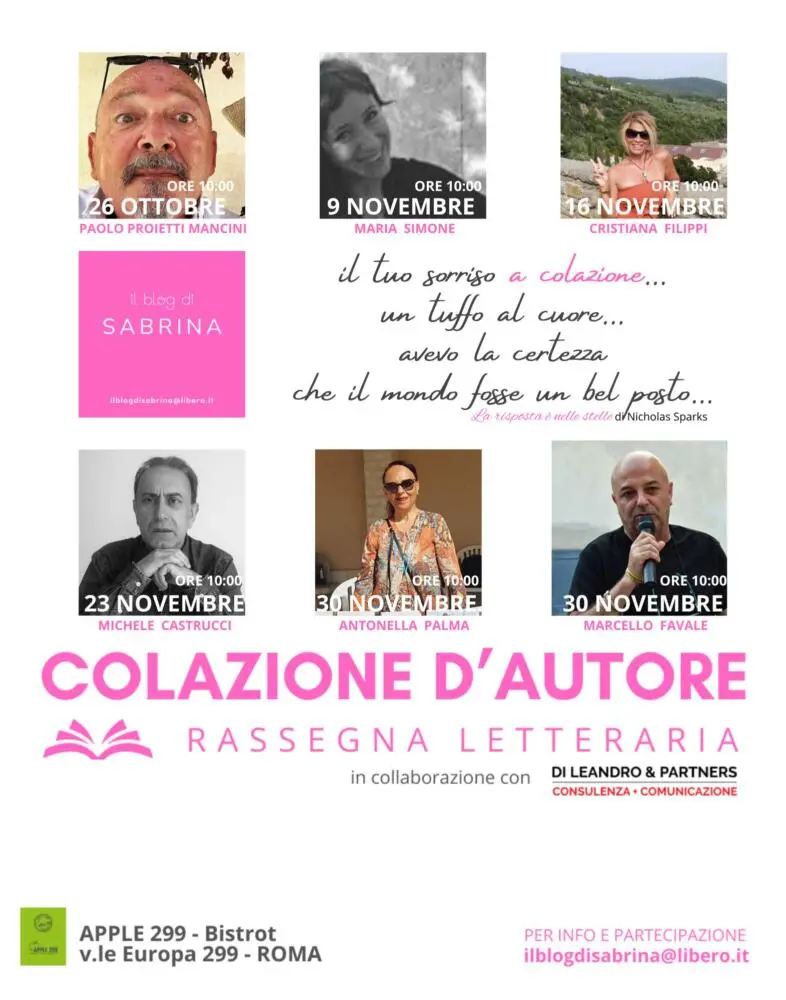 Il blog di Sabrina in collaborazione con il Gruppo Editoriale Di Leandro & Partners, organizza COLAZIONE D’AUTORE, rassegna letteraria che prevede incontri tra autori e lettori nella splendida cornice del bistrot Apple299, a Roma, in viale Europa 299, dove autori emergenti, noti e meno noti del panorama letterario italiano, condivideranno opere ed esperienze, in un confronto letterario con colleghi scrittori provenienti da tutta Italia.