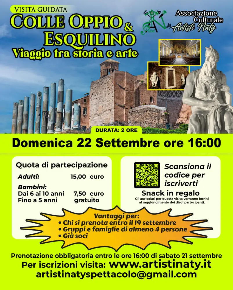 domenica 22 settembre ore 16:00 Prenotazione Obbligatoria, cliccando sul seguente link: https://artistinaty.it/event/colle-oppio-esquilino-viaggio-tra-storia-e-arte/