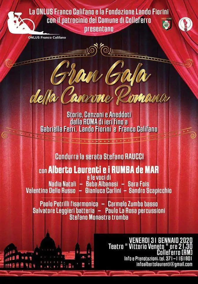 Venerdì 31 Gennaio alle ore 21.30 Concerto dedicato alla canzone romana nel teatro Vittorio Veneto di Colleferro per raccolta fondi a scopo di beneficenza con il patrocinio del comune di Colleferro, la Onlus Franco Califano e la Fondazione Lando Fiorini, diretto dal m.ro Alberto Laurenti,compositore e arrangiatore preferito da Califano negli ultimi vent’anni.