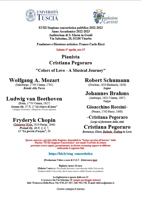 Il programma “Colors of Love – A Musical Journey”, proposto da Cristiana Pegoraro nella Stagione concertistica dell’Università della Tuscia, è dedicato all’amore in musica e nella poesia e consentirà di ascoltare pagine celebri della letteratura pianistica di grandi compositori quali Mozart, Beethoven, Chopin, Schumann, Brahms e Rossini, ispirati dalle donne della loro vita, e sue composizioni originali.
