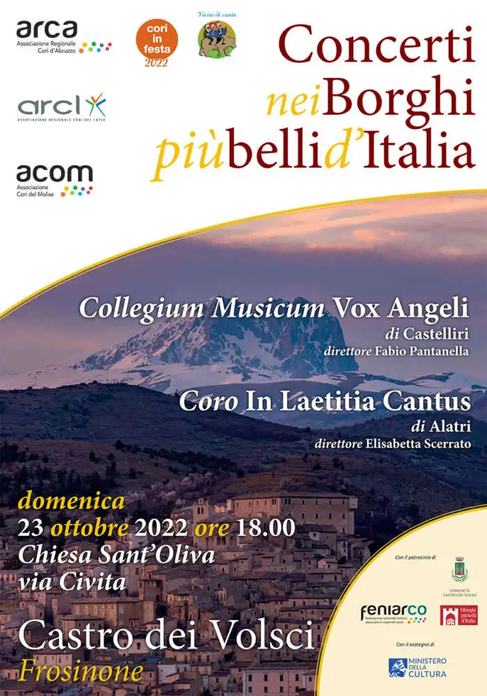 Concerti nei Borghi più Belli d’Italia domenica 23 ottobre 2022 ore 18.00 a Castro dei Volsci presso la Chiesa Sant’Oliva con il Collegium Musicum Vox Angeli di Castelliri direttore Fabio Pantanell e il Coro In Laetitia Cantus di Alatri direttore Elisabetta Scerrat.