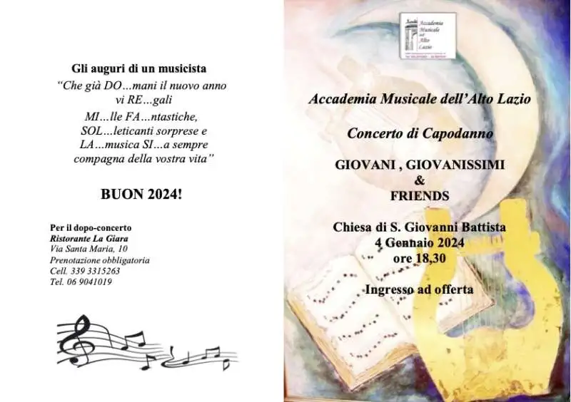 L’AMAL (Accademia Musicale dell’Alto Lazio) organizza il Concerto di Capodanno alla Chiesa di San Giovanni Battista CAMPAGNANO DI ROMA – Come ormai d’abitudine, vogliamo salutare il nuovo anno con un concerto di giovani e giovanissimi musicisti che sono ormai diventati un nostro fiore all’ occhiello! La musica è un inestimabile veicolo di condivisione, di aggregazione, [...]...