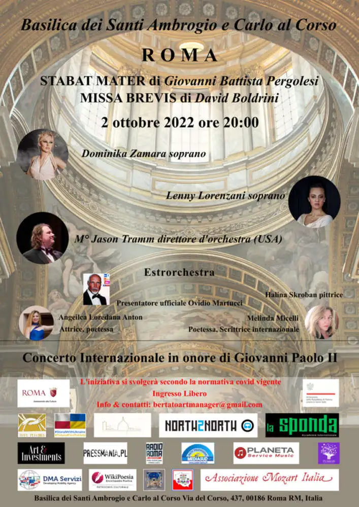 Si svolgerà il due ottobre alle ore 20:00 presso la Basilica dei Santi Ambrogio e Carlo al Corso, Via del Corso, 437, 00186 Roma RM, Italia il Concerto Internazionale in onore di Giovanni Paolo II.