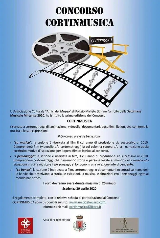 L’Associazione Culturale “Amici del Museo” di Poggio Mirteto (RI), nell’ambito della Settimana Musicale Mirtense 2020, ha istituito la prima edizione del Concorso CORTINMUSICA riservato a cortometraggi di: animazione, videoclip, documentari, docufilm, fiction, est.. con tema la musica e le sue espressioni.